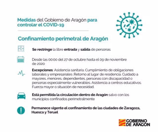 Lambán ha recordado, en rueda de prensa, que las tres capitales de provincia --Huesca, Zaragoza y Teruel-- ya están en confinamiento perimetral desde la semana pasada, que se mantiene, y que ahora se amplia al conjunto de la región de forma que los habitantes del resto de municipios pueden transitar libremente dentro de Aragón, pero no podrán entrar ni salir de la comunidad autónoma, "salvo por causas justificadas", ha expuesto.