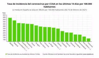 Tasa de incidencia del coronavirus por comunidad autónoma en los últimos 14 días por 100.000 habitantes. - EPDATA