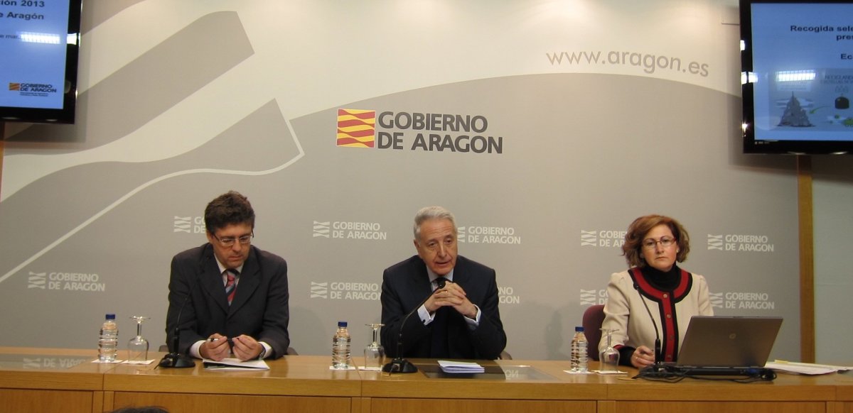 El consejero de Agricultura, Ganadería y Medio Ambiente del Gobierno de Aragón, Modesto Lobón, la directora general de Calidad Ambiental del Ejecutivo autonómico, Pilar Molinero, y el gerente de Zona de Ecovidrio, Óscar Acedo, han dado a conocer este viernes la campaña en rueda de prensa, que se inicia el lunes.