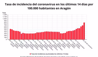 Tasa de incidencia del coronavirus en los últimos 14 días por 100.000 habitantes en Aragón. - EPDATA