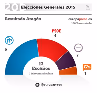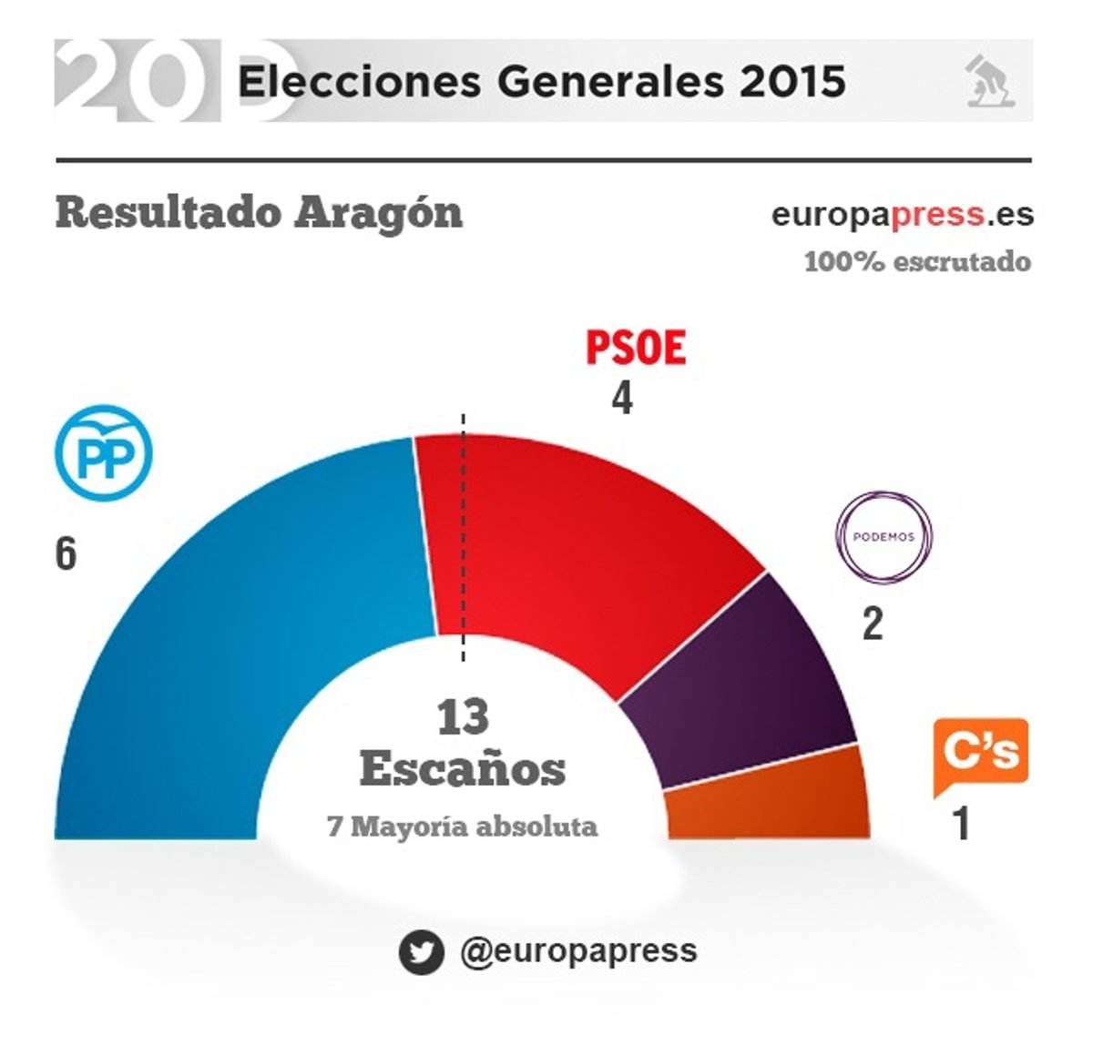 El PP-PAR ha vuelto a ganar las elecciones en Aragón, aunque ha pasado de 8 a 6 diputados, al perder un escaño por la provincia de Huesca y otro por Zaragoza. Por vez primera tienen representación Podemos y Ciudadanos, con 2 y 1 escaños, respectivamente. Chunta Aragonesista (CHA)-Izquierda Unida (IU), que han concurrido como Unidad Popular (UP) se han quedado sin su diputado.
