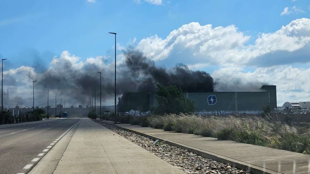 Los Bomberos de Zaragoza trabajan en contener las llamas de un gran incendio que se ha declarado este jueves en la nave de la empresa de reciclaje RAEEL S.A. en el Parque Tecnológico de Reciclado de Zaragoza.