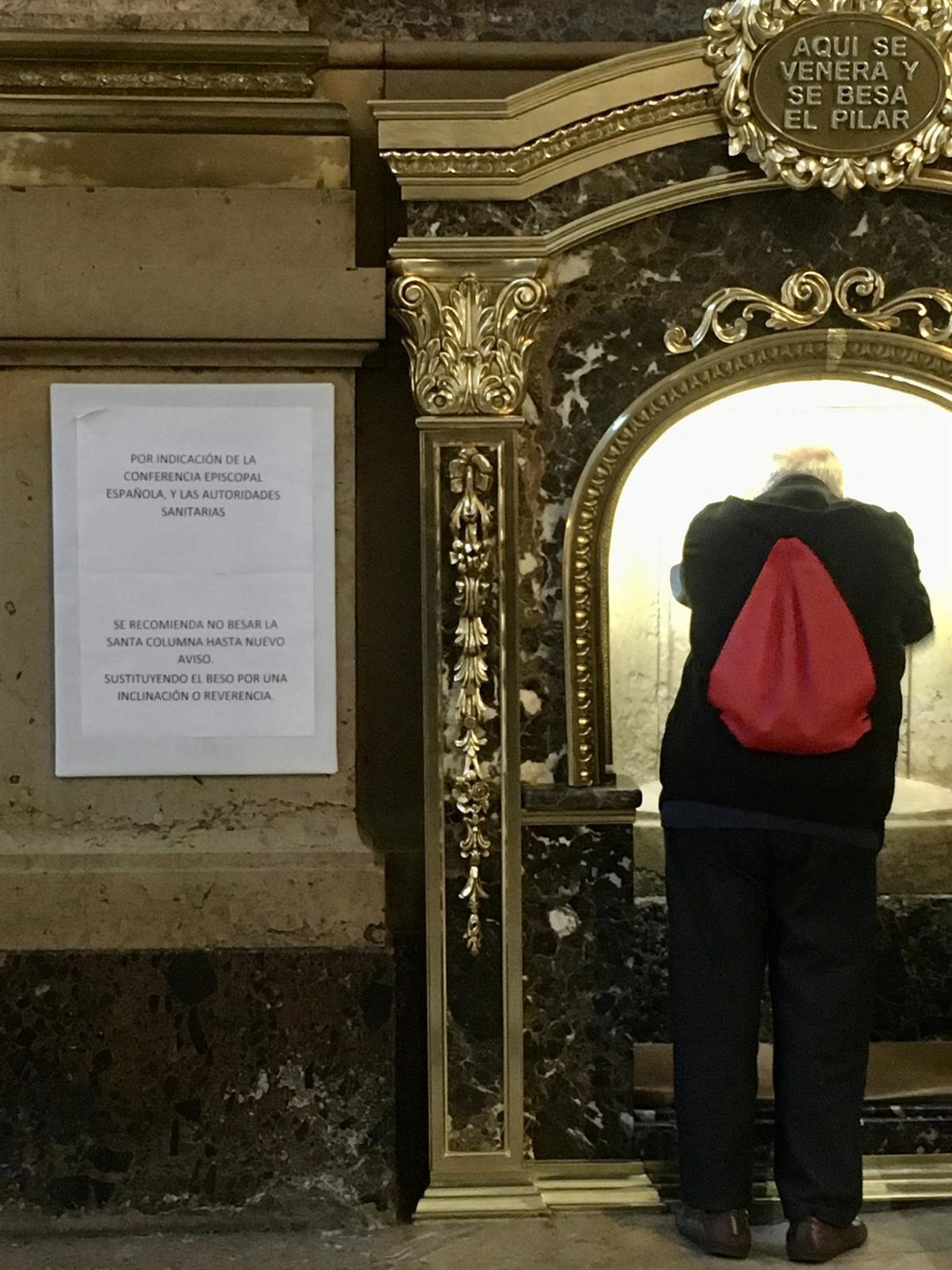 El Arzobispado de Zaragoza ha colocado varios carteles con recomendaciones para que los fieles eviten besar la Columna de la Virgen del Pilar así como otras figuras religiosas, como el Cristo de la Capilla de San Juan Bautista, ante la expansión del coronavirus.