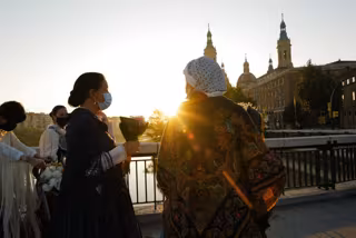Mujeres vestidas de baturras se dirigen a la Basílica del Pilar para honrar y realizar la tradicional ofrenda de flores a la Virgen del Pilar el día de su festividad, a 12 de octubre de 2021, en Zaragoza. - Fabián Simón - Europa Press