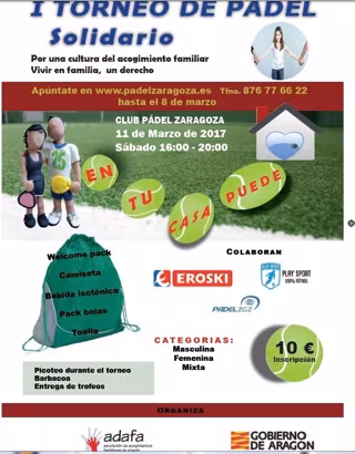 La Asociación de Acogimientos Familiares de Aragón (Adafa) y el Gobierno autonómico, a través del Instituto Aragonés de Servicios Sociales, han organizado un torneo de pádel solidario. La cita deportiva será el 11 de marzo en Zaragoza.