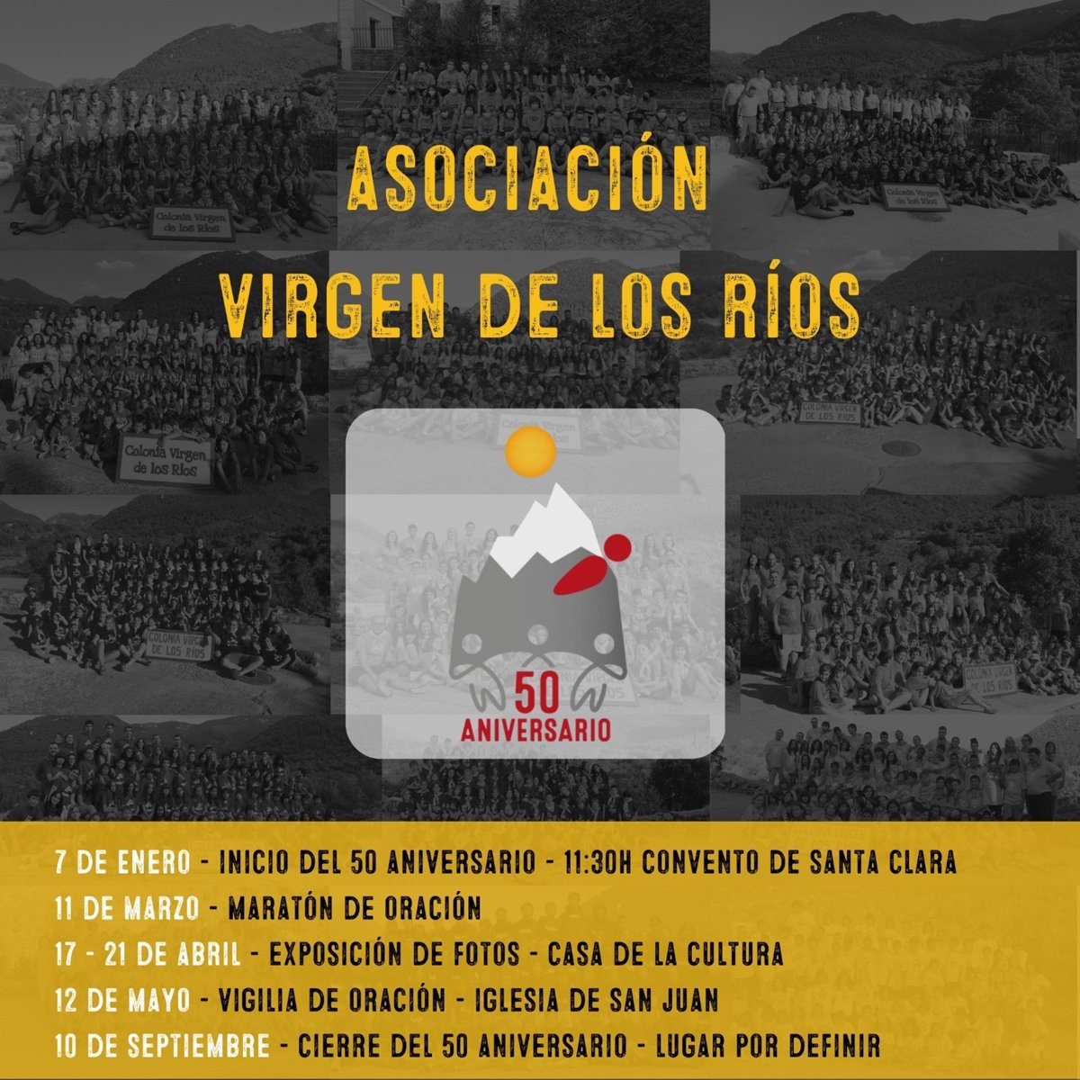 La Asociación Colonia Virgen de los Ríos, conocida como grupo de Rasal, celebra este año su 50 aniversario. El programa conmemorativo arranca este sábado, 7 de enero, con una eucaristía en el Monasterio de Santa Clara de Monzón, programada a las 11.30 horas.