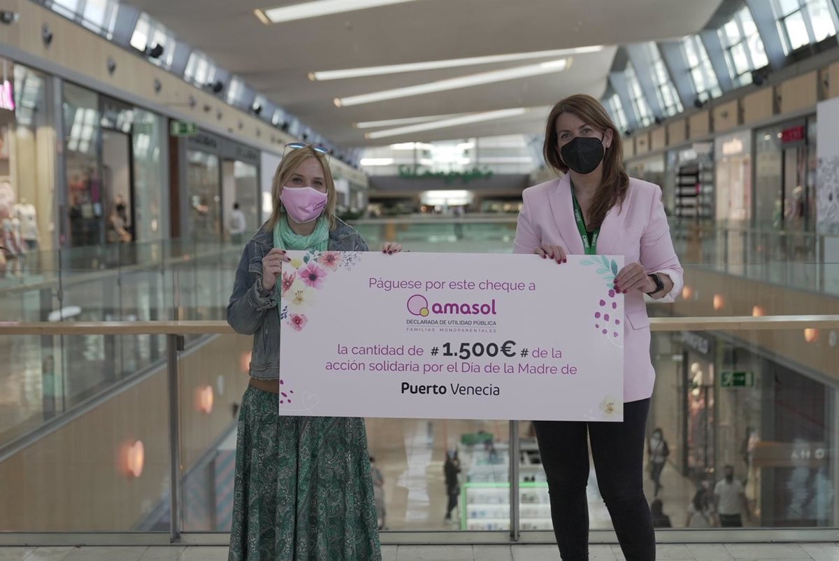 realidad que este año Puerto Venecia ha querido tener presente haciendo un guiño con las acciones del Día de la Madre que ha celebrado el 'shopping resort' de Zaragoza, y que se ha traducido en una donación de 1.500 euros a la Asociación de Madres Solas (AMASOL).