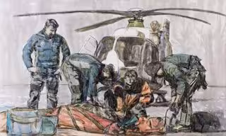 El cuadro 'Rescate' es una obra de técnica mixta sobre papel, de 185 por 112 centímetros, que la Comandancia de la Guardia Civil situará en una de las dependencias del Centro de Adiestramientos Específicos de la Guardia Civil en Candanchú (Huesca), dada la temática del mismo que recoge a un equipo de rescate en plena acción, al pie de un helicóptero y atendiendo a un montañero, han apuntado las mismas fuentes.