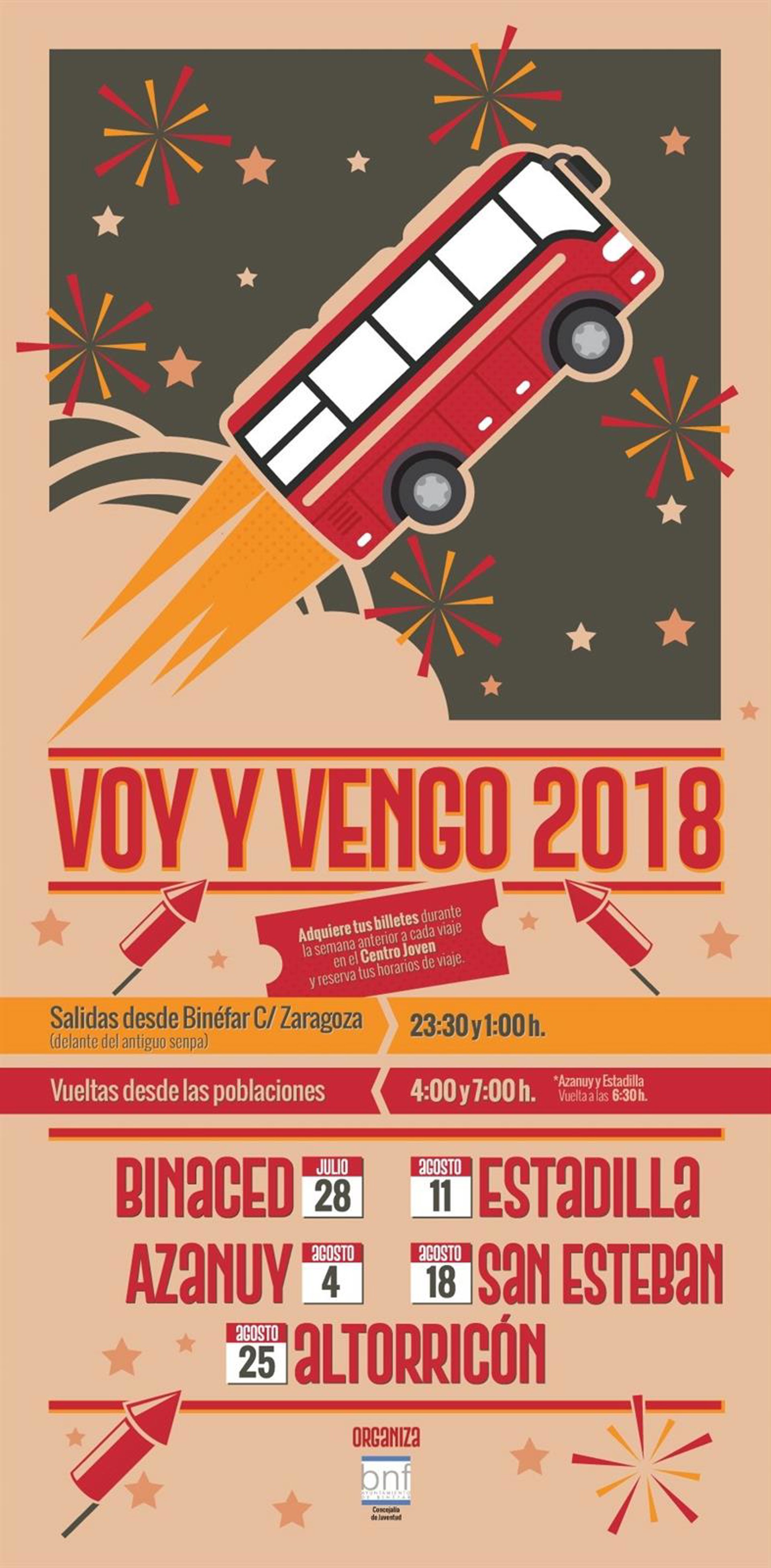 La Concejalía de Juventud del Ayuntamiento de Binéfar pone a disposición de los jóvenes un año más el programa 'Voy y vengo', de prevención de accidentes de tráfico, que los llevará en transporte público a las fiestas patronales de algunas localidades de la zona, comenzando por Binaced este sábado, 28 de julio, para el que ya se pueden adquirir las entradas y reservar horarios en el Centro Joven.