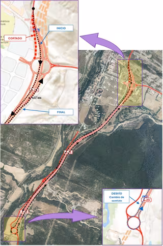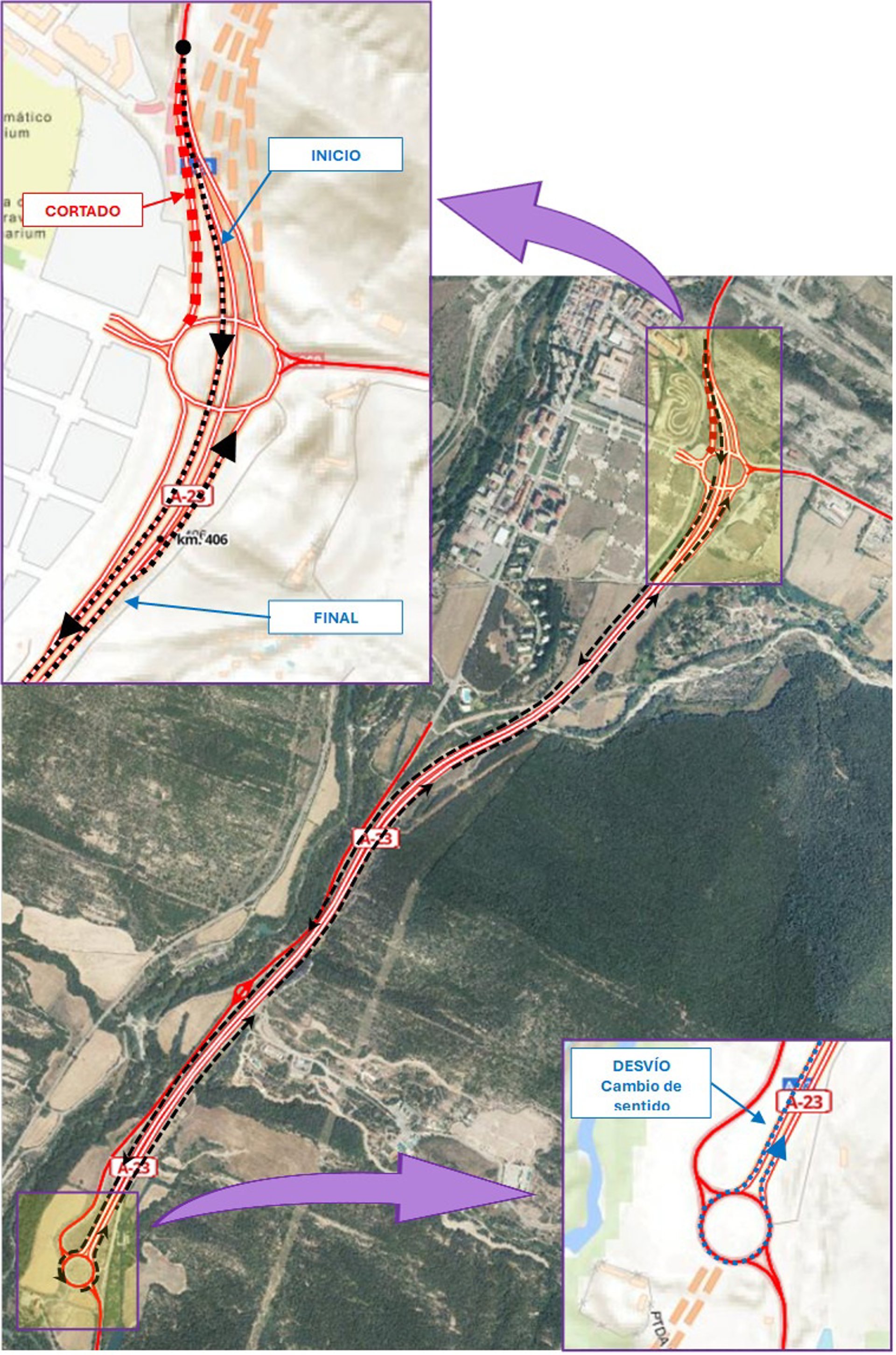 Mapa con el tramo afectado por las obras en la A-23. - MINISTERIO DE TRANSPORTES Y MOVILIDAD SOSTENIBLE