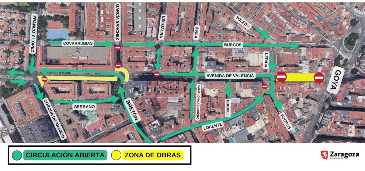 En concreto, los operarios entrarán a actuar en la conexión de Tomás Bretón con García Sánchez. Por eso, el tráfico que continuaba recto, deberá ahora subir en dirección hacia el Hospital Clínico, es decir, los vehículos que iban por Tomás Bretón y seguían por García Sánchez, como no podrán continuar, tendrán que girar hacia la izquierda y utilizarán un tramo de la avenida de Valencia.