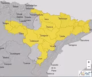 Por otra parte, se ha establecido un aviso de nivel amarillo por temperaturas máximas en centro y sur de Huesca, Bajo Aragón, Ibérica zaragozana y Ribera del Ebro, entre las 13.00 y las 21.00 horas.