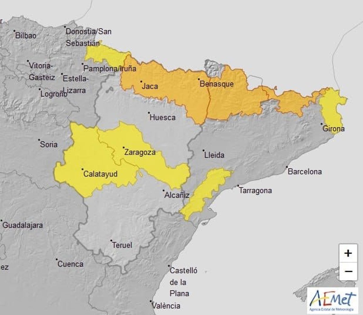 Por otra parte, la Aemet ha activado el aviso amarillo por vientos en la Ibérica Zaragozana y la Ribera de Ebro para el domingo, desde las 00.00 hasta las 23.59 horas. Una alerta de este mismo nivel se ha fijado en Albarracín y Jiloca, Gúdar y Maestrazgo y en la Ibérica Zaragozana este mismo domingo, entre las 00.00 y las 10.00 horas.