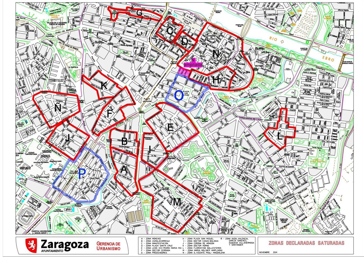 En la actualidad, Zaragoza cuenta con quince zonas catalogadas como saturadas, que se mantienen así desde su última revisión en 2005: Moncasi, Zumalacárregui, Manifestación, plaza Santa Cruz, León XIII, Doctor Cerrada, Predicadores, plaza San Miguel, Doctor Casas, Corona de Aragón, Doctor Horno, Florentino Ballesteros, María Moliner, La Magdalena, y Avenida de Valencia-Santander.