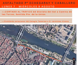A partir de este lunes, 7 de agosto, y hasta este miércoles, el Ayuntamiento de Zaragoza tiene previsto realizar trabajos de asfaltado en dos tramos distintos del Paseo de Echegaray y Caballero.
