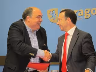 El consejero municipal de Acción Social y Deportes del Ayuntamiento de Zaragoza, Roberto Fernández, y el director territorial de Aragón, Navarra y La Rioja de CaixaBank, Raúl Marqueta, han suscrito el acuerdo, que estará vigente hasta el 31 de diciembre de 2017.