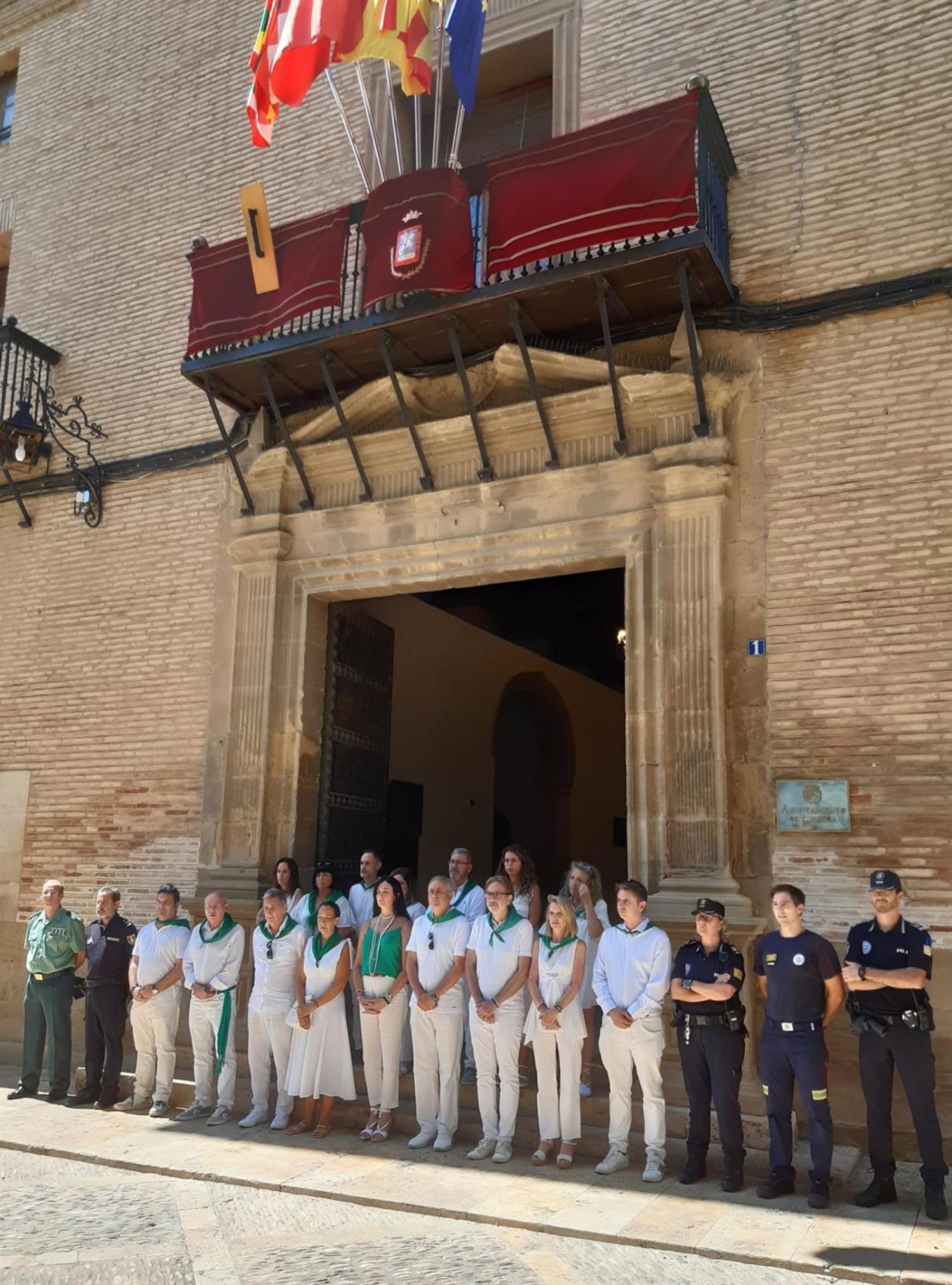 La Corporación Municipal oscense ha guardado un minuto de silencio, frente a las puertas del Ayuntamiento de Huesca, a las 14.00 horas, tras las dos últimas denuncias presentadas por agresión sexual coincidiendo con la celebración de las Fiestas de San Lorenzo, que concluyen este martes.