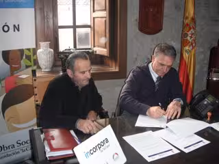 El alcalde de la localidad zaragozana, Joaquin Llop Ráfales, y el presidente de la Asociación de Personas con Discapacidad de Caspe y Comarca (ASADICC) y representante de las entidades 'Incorpora' Aragón, Miguel Tena Taberner, han firmado un convenio de colaboración con el compromiso de fomentar la integración sociolaboral de personas con especiales dificultades para acceder a un puesto de trabajo y promover acciones de Responsabilidad Social Empresarial, en el marco del programa 'Incorpora' de la Obra Social 'la Caixa'.