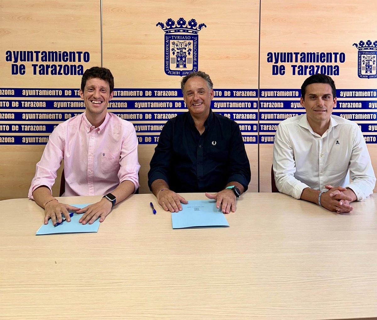 La firma del convenio se ha llevado a cabo esta mañana con la presencia del alcalde de Tarazona, Tono Jaray, el concejal de Deportes, Pablo Escribano y el presidente de la Agrupación Balonmano Tarazona Carlos Baños.