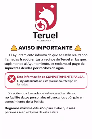 Tras aseverar el Ayuntamiento de Teruel que no está realizando llamadas de este tipo, se ha pedido la máxima difusión para evitar que más personas sean víctimas de esta estafa.