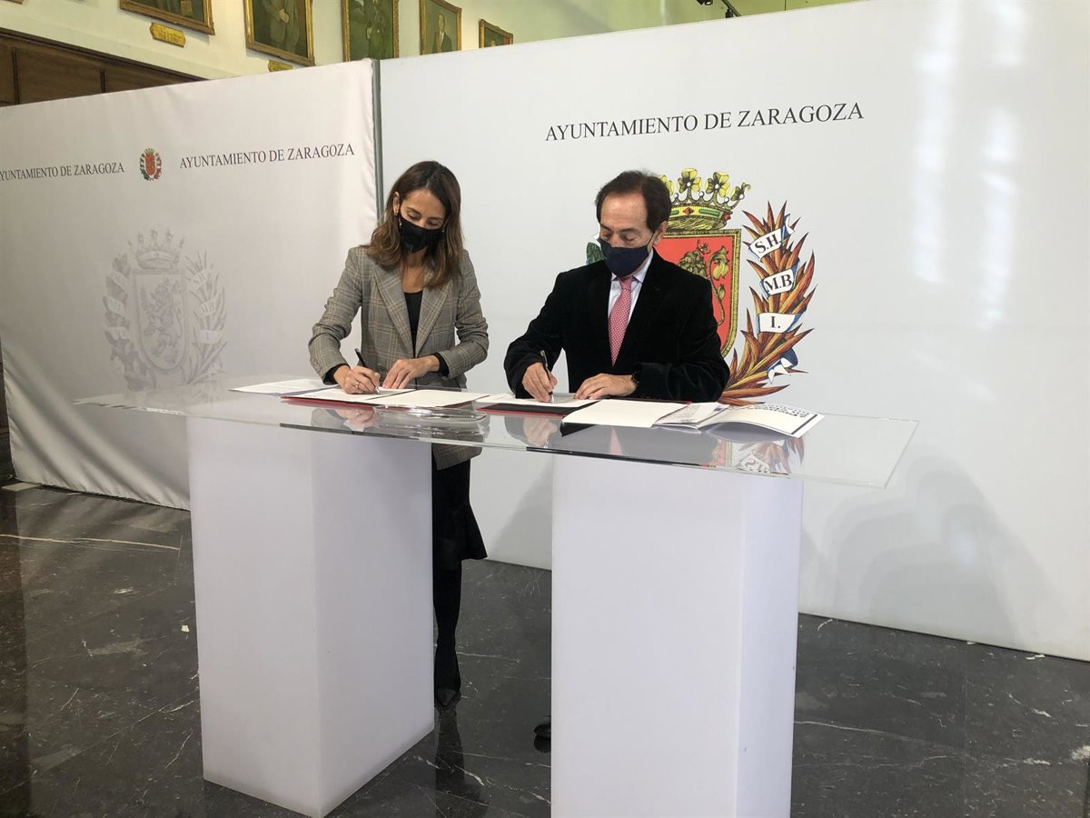 María Navarro y Salvador Arenere durante la firma, en el Ayuntamiento de Zaragoza - EUROPA PRESS