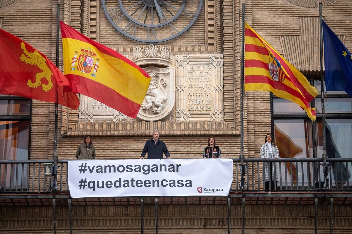 El Ayuntamiento de Zaragoza sigue animando a los zaragozanos a "ganar la batalla" al coronavirus y esta tarde ha colocado una pancarta solidaria en el balcón de la casa consistorial con un claro mensaje: '#vamosaganar'