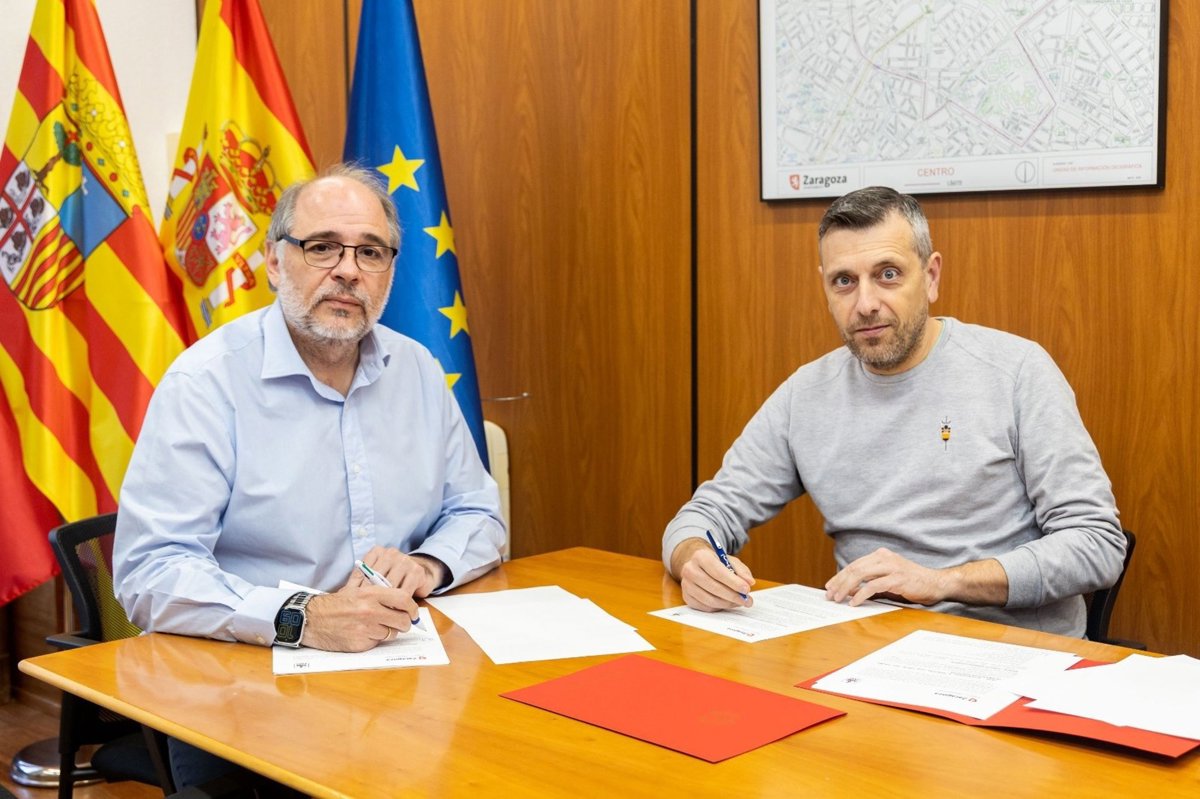 El consejero municipal de Participación Ciudadana y Régimen Interior, Alfonso Mendoza, y el presidente de la FABZ, Arturo Sancho, firman el convenio de colaboración - MIGUEL GRACIA