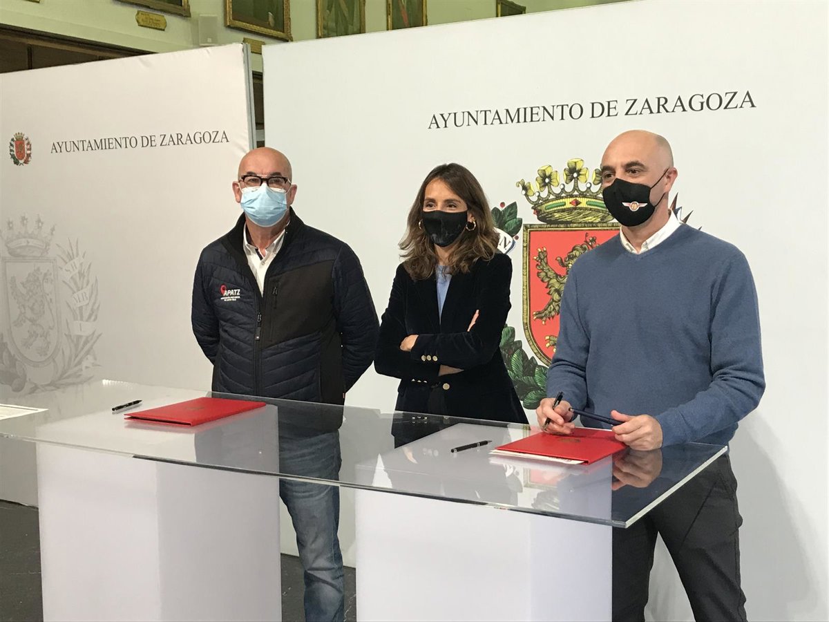 La consejera municipal de Presidencia, Hacienda y Régimen Interior, María Navarro; el presidente de la Asociación Provincial de Auto-Taxi de Zaragoza, Mariano Morón; y el presidente de la Cooperativa Auto-Taxi de Zaragoza, Sergio Artal, han firmado sendos convenios que permitirá a estos autónomos sufragar los costes de la homologación por metrología de los taxímetros.