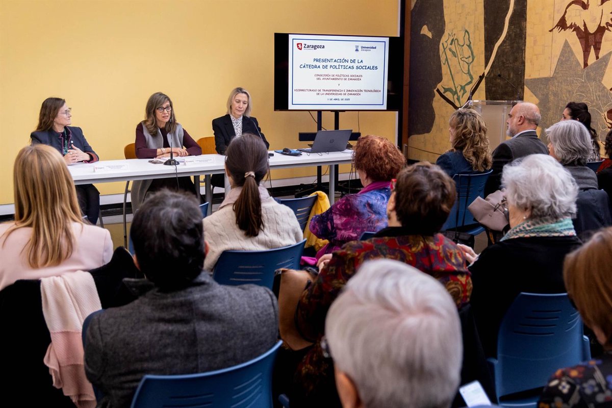 La consejera municipal de Políticas Sociales del Ayuntamiento de Zaragoza, Marian Orós, y la vicerrectora de Transferencia e Innovación Tecnológica en funciones de la Universidad de Zaragoza, Gloria Cuenca Bescós; y la directora de la cátedra, Mariola García Uceda, han presentado este martes este proyecto, que echa a andar hace algunos meses con las primeras actividades.
