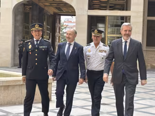 El presidente del Gobierno de Aragón, Jorge Azcón, con el delegado del Gobierno en Aragón, Fernando Beltrán, y dos mandos policiales en el Edificio Pignatelli. - EUROPA PRESS.