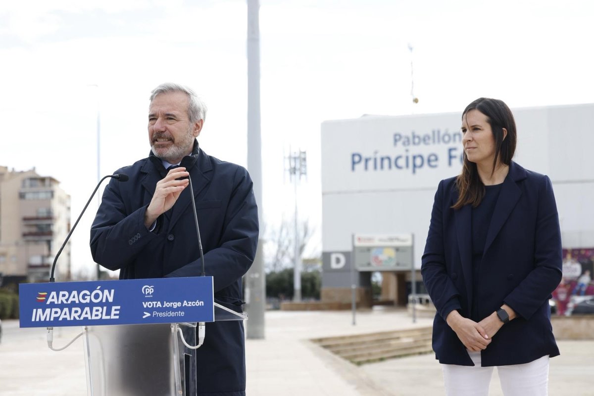 El candidato del PP a la Presidencia de Aragón, Jorge Azcón, en una rueda de prensa junto al Pabellón Príncipe Felipe. - PP ARAGÓN