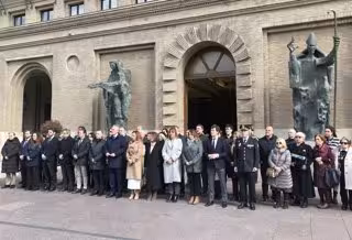 Azcón ha participado en un acto a las puertas del Ayuntamiento de Zaragoza en el que se ha guardado un minuto de silencio para honrar a las víctimas del 11M. También ha asistido el vicepresidente del Gobierno de Aragón, Alejandro Nolasco; la alcaldesa de Zaragoza, Natalia Chueca; todos los grupos municipales; el delegado del Gobierno en Aragón, Fernando Beltrán; y la Justicia de Aragón, Conchita Gimeno.