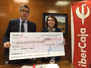 El acto se ha celebrado en la Dirección Provincial de Ibercaja en la ciudad. La aportación económica es el resultado de una acción solidaria que la Obra Social ha promovido un año más a través de la Carrera Popular Ibercaja por la Integración de Huesca, celebrada el pasado 6 de noviembre.