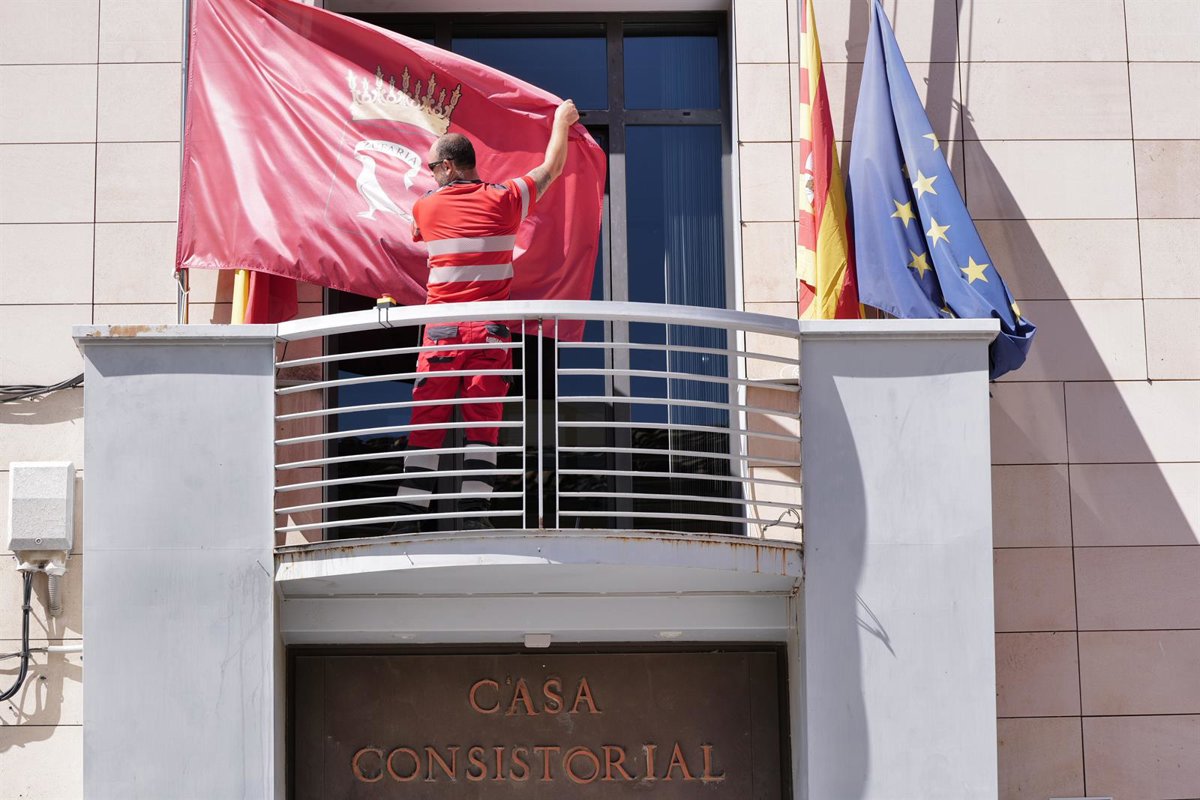 Un trabajador coloca las banderas del Ayuntamiento de Zuera a media asta tras el fallecimiento por atropello del alcalde de Zuera cuando circulaba en bicicleta, a 1 de julio de 2023, en Zuera, Zaragoza, Aragón (España). - Fabián Simón - Europa Press