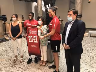Al acto de la firma del acuerdo, que ha tenido lugar en el museo Pablo Gargallo de Zaragoza, también han estado presentes los jugadores Dylan Ennis, del equipo masculino, y Laura Nicholls, del femenino.