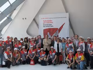 Al final de esta obra de Zaha Hadid, Belloch se ha sumado a ellos para fotografiarse con un numeroso grupo de voluntarios acompañado de varios consejeros municipales y han partido en comitiva hasta el Palacio de Congresos.