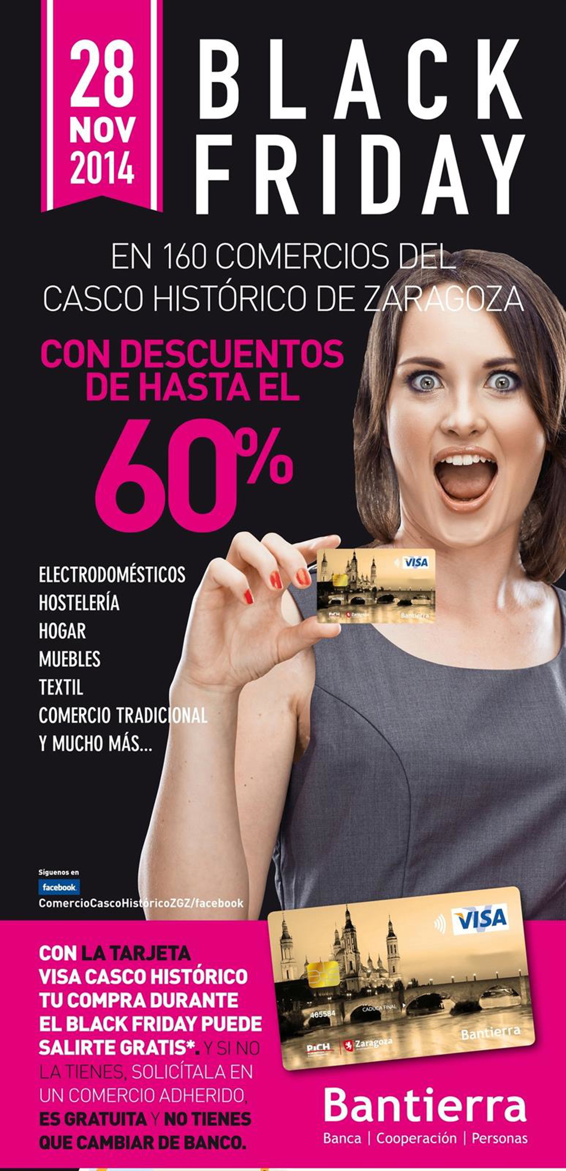 La Visa Casco Histórico, emitida por Bantierra, en colaboración con las principales asociaciones de comercio del centro de Zaragoza, se suma este viernes a la celebración del 'Black Friday', con descuentos añadidos y nuevas ventajas para sus titulares.