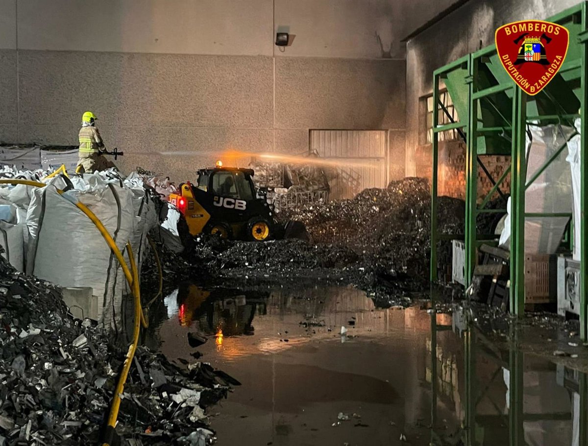 Efectivos de los bomberos de la Diputación de Zaragoza (DPZ) y del Ayuntamiento de Zaragoza han sofocado este viernes un incendio originado en una planta de reciclaje de metales ubicada en el polígono San Miguel de Villanueva de Gállego, en el que han ardido 15 toneladas de material.