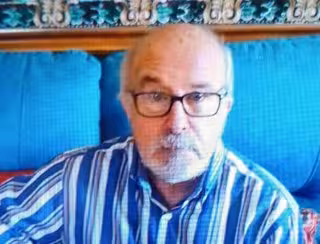 Se trata de una persona con movilidad reducida y principio de parkinson que tiene el pelo y la barba de color blanco y viste pantalón y camiseta de color azul.