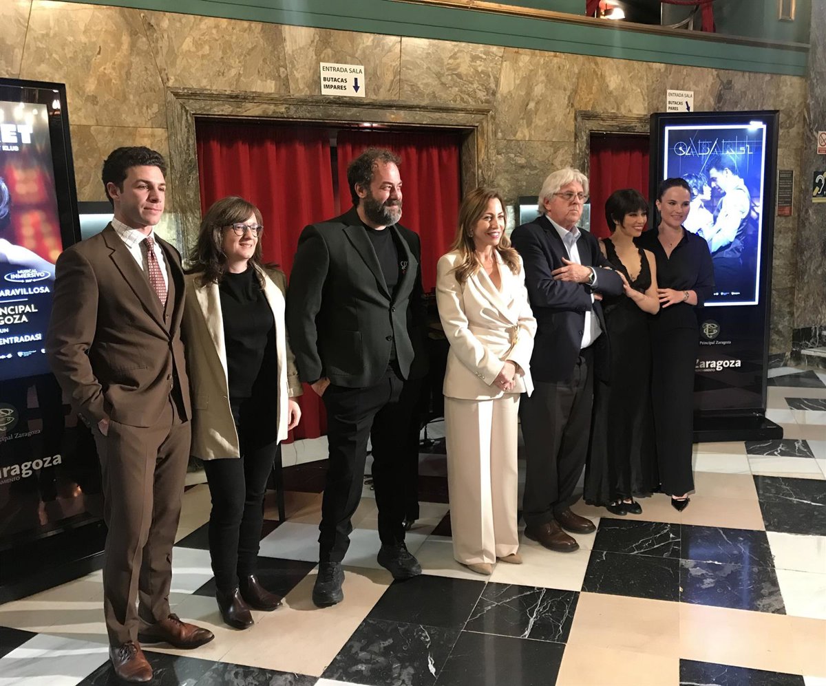 La alcaldesa de Zaragoza, Natalia Chueca; el gerente del PMAEI, Chema Turmo; el CEO de LetsGo Company, Iñaki Díaz; la responsable de proyectos, Ángela Gudino; y los actores Amanda Digón y Pepe Nufrio presentan 'Cabaret, el musical' - EUROPA PRESS
