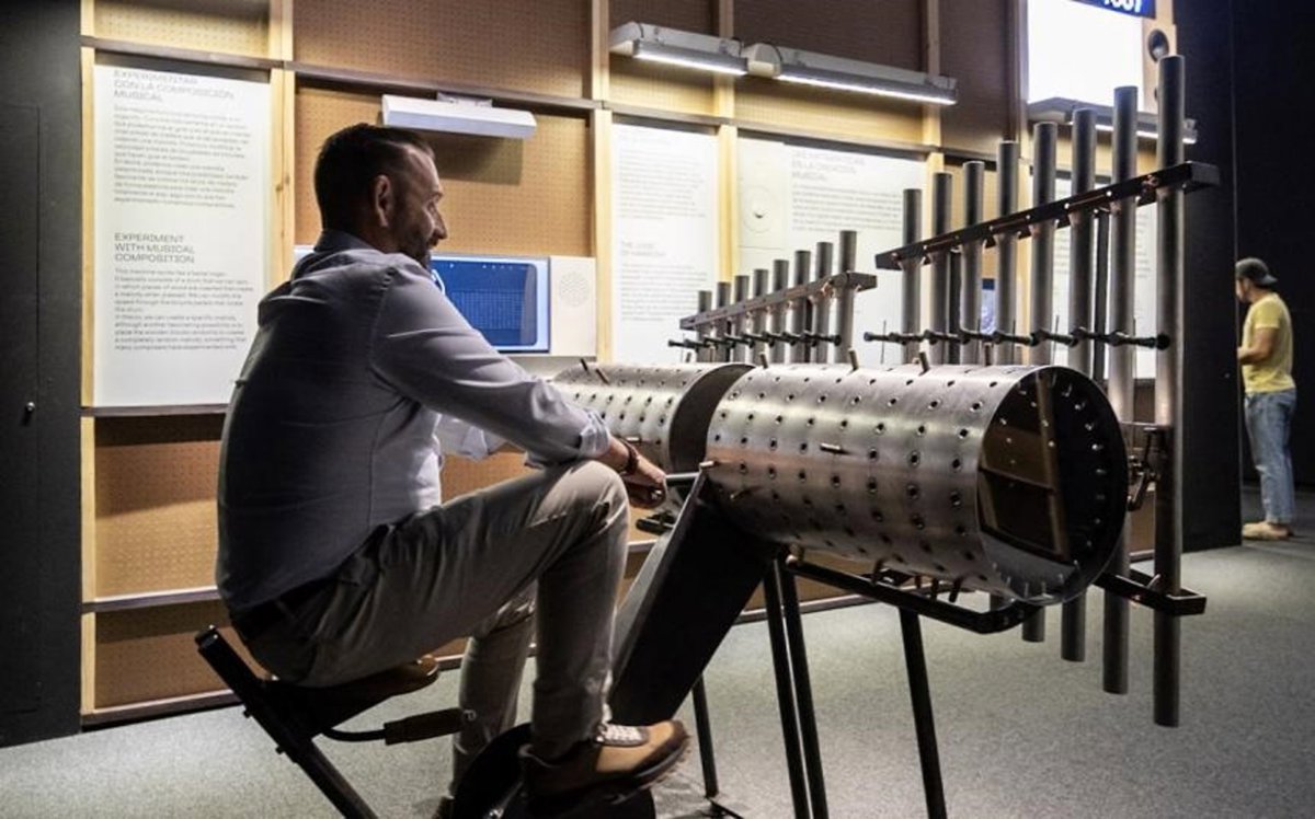 Un visitante prueba la composing machine en la exposición 'Música y matemáticas en CaixaForum Zaragoza. - FUNDACIÓN 'LA CAIXA'