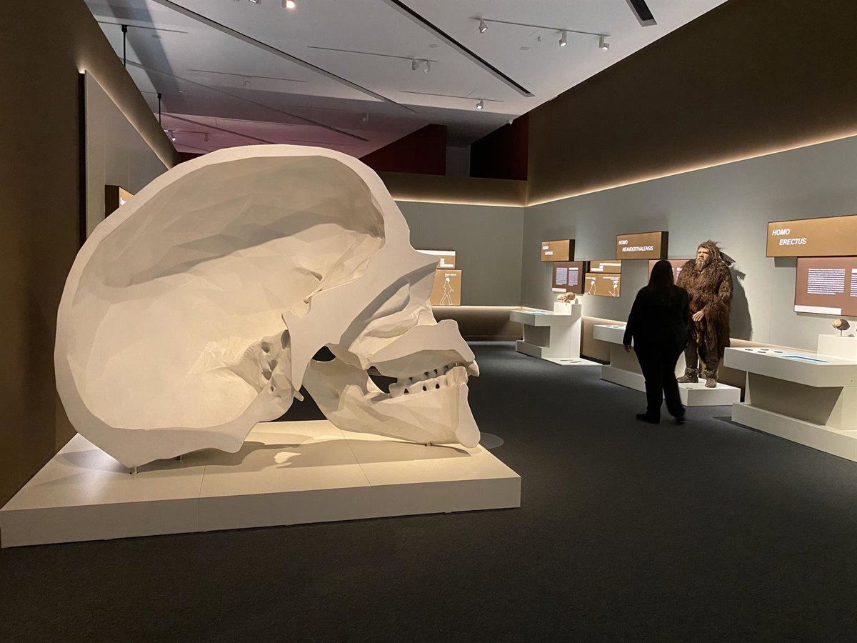 En otra zona de la exposición hay réplicas de cuatro especies de homínidos, como el australopitecus afarensis, el homo erectus, el neanderthal y el homo sapies, lo que posibilita estudiar la evolución del cerebro a lo largo de miles de años. Ha comentado que los restos fósiles son de partes duras del cuerpo, nunca de las blandas, pero la ciencia sí puede inferir algunas características del habla por el comportamiento de los ancestros.