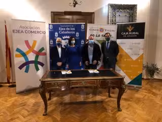 El acto se ha celebrado en el Ayuntamiento ejeano y ha contado con la presencia de la alcaldesa, Teresa Ladrero; del presidente de Comarca Cinco Villas, Santos Navarro; del director de Desarrollo Negocio en Caja Rural de Aragón, José Luis Larragay, y del presidente de Ejea Comercio, Juan Pons .