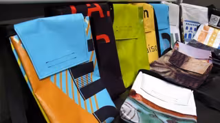 El material con el que se ha trabajado para la elaboración de estas bolsas han sido las lonas y pancartas utilizadas para la difusión exterior de las exposiciones temporales que organiza la Universidad de Zaragoza en el Paraninfo.