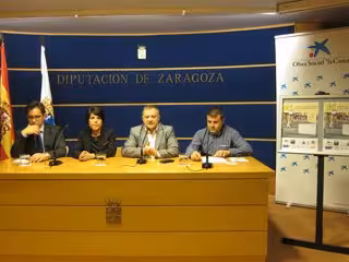 El alcalde de Borja, Eduardo Arilla, el padre de un niño afectado por esta enfermedad, Javier Cruz, la directora del Área de Negocio del Bajo Aragón de Caixabank, Raquel Baldellou, y el presidente de la Asociación de Voluntarios de 'la Caixa', Máximo Abadía, han presentado en rueda de prensa, en la Diputación de Zaragoza (DPZ), esta iniciativa solidaria que mantendrá el plazo de inscripciones abierto hasta el 24 de mayo, a un precio de 10 euros, en la página web 'www.8kborja.com', donde se puede colaborar con esta causa.