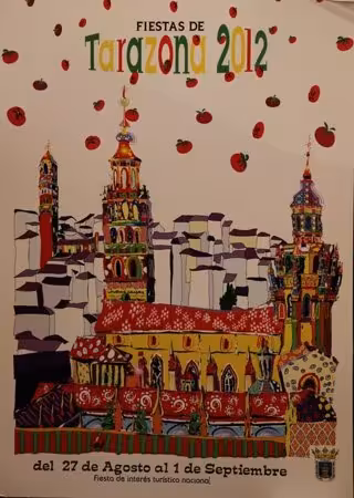 Su autora es la zaragozana Ana María Valderrama, que obtendrá como premio 750 euros. Se trata de un cartel en el que la imagen de la Catedral predomina sobre el resto, acompañada por una lluvia tomates, explica el Ayuntamiento de Tarazona en un comunicado.