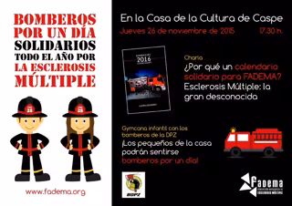 'Bomberos por un día, solidarios todo el año por la esclerosis múltiple' es el lema de la jornada que se celebrará este jueves, 26 de noviembre, en la localidad zaragozana de Caspe, organizada por la Fundación Aragonesa de Esclerosis Múltiple (FADEMA) y la Asociación Deportiva y Cultural Bomberos de la Diputación Provincial de Zaragoza y que tendrá lugar en la Casa de Cultura del municipio.