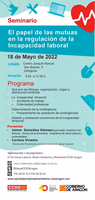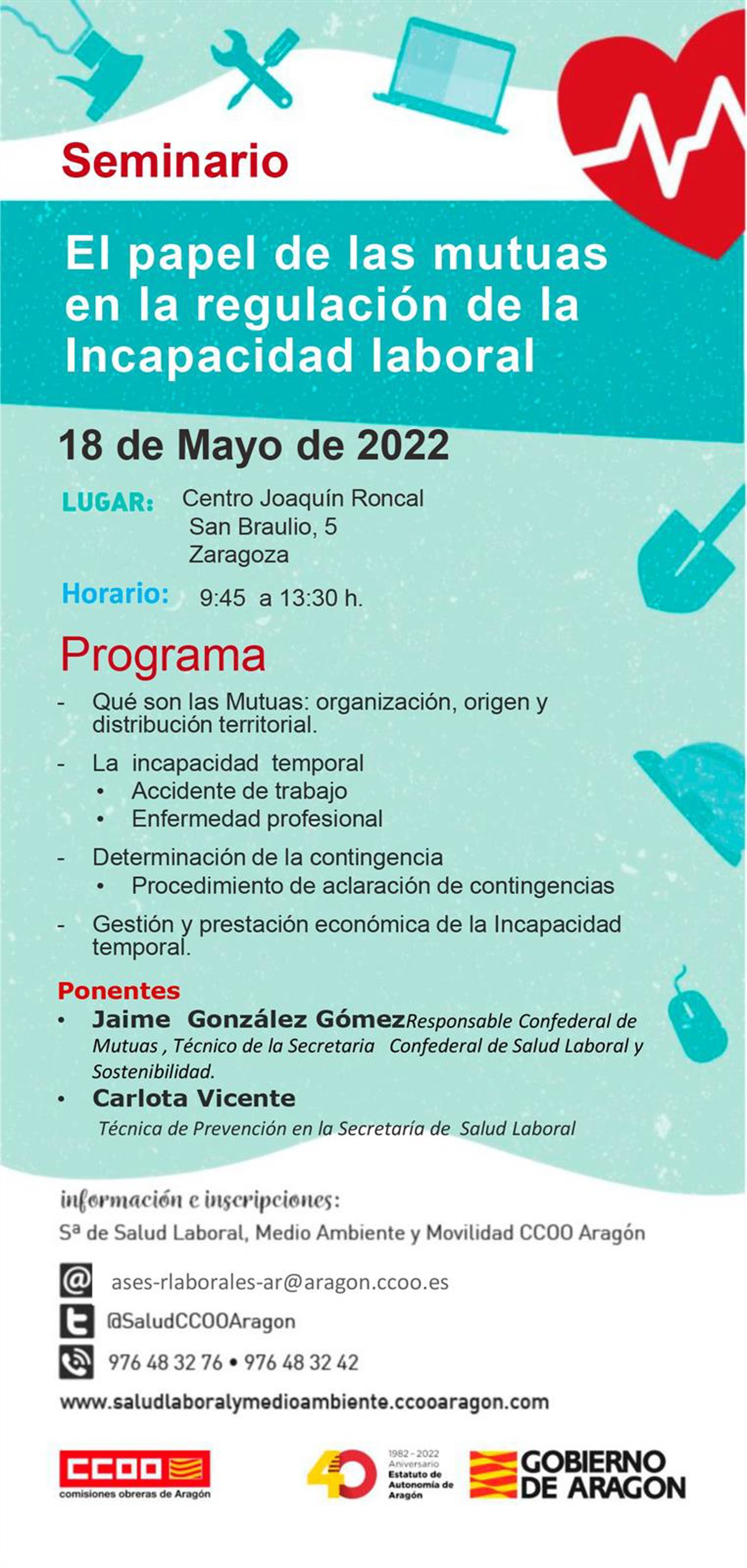 La Secretaría de Salud Laboral de CCOO Aragón celebrará el próximo miércoles, 18 de mayo, el seminario formativo en prevención de riesgos laborales 'El papel de las mutuas en la regulación de la incapacidad temporal'.