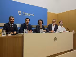 El "Researchers Night" lo ha presentado el consejero municipal de Economía y Cultura del Ayuntamiento de Zaragoza, Fernando Rivarés; la consejera municipal de Participación Ciudadana, Elena Giner; el responsable de actividades de CaixaForum, Juan Vázquez; el miembro de la Fundación Española para la Ciencia y la Tecnología, César López; y el organizador del evento, Guillermo Orduña.