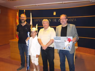 El diputado delegado de Turismo de la Diputación Provincial de Zaragoza (DPZ), Bizén Fuster, el concejal de Turismo del Ayuntamiento de La Almunia, José Manuel Latorre, y el presidente de la Asociación Cultural L'Albada, Gonzalo Orna, han presentado este miércoles en rueda de prensa la nueva edición del Dance de Cabañas que este año incorpora, como novedad, la presencia de un cronista, que será en esta primera ocasión el profesor José María Pemán.